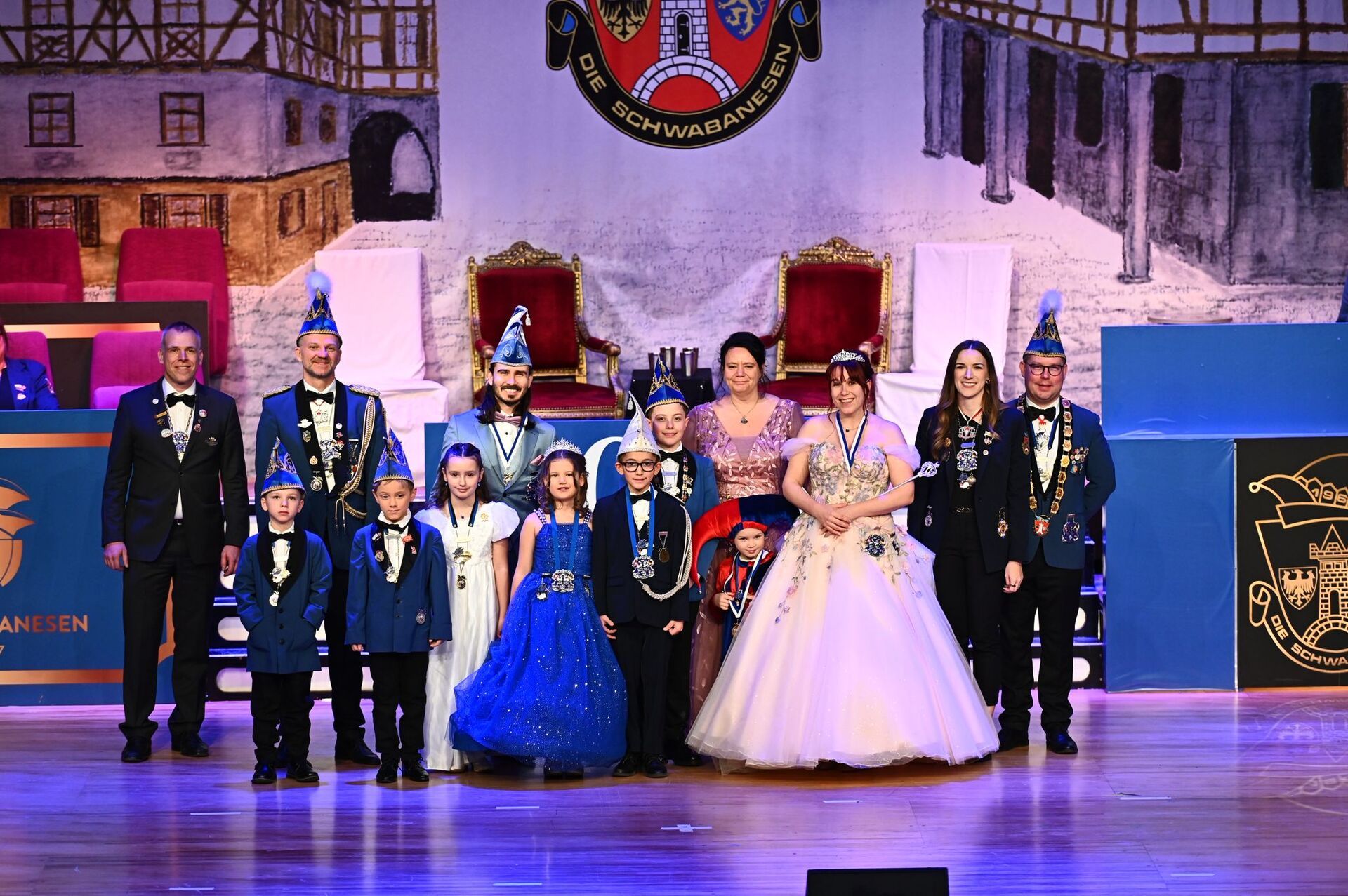 Foto: Schwabanesen / Tom Reich | Der diesjährige Hofstaat samt Prinzenpaaren auf der Bühne