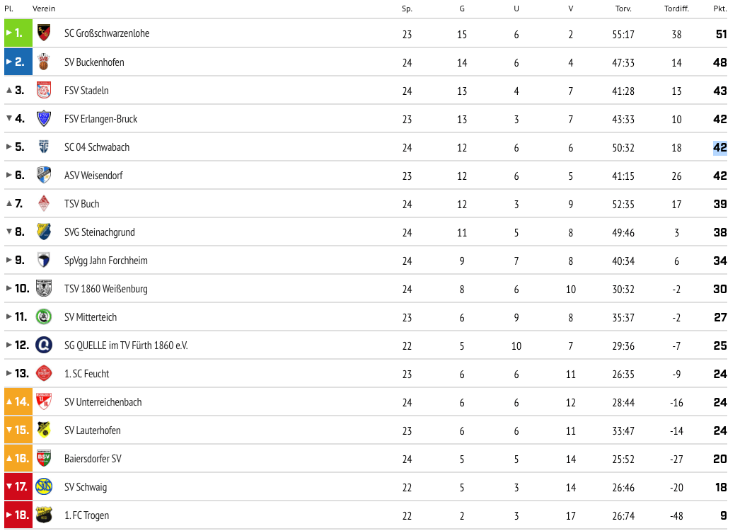 ⚽️ Erfolgreiche Fußballwoche für Schwabacher Vereine - Doppelsieg in der Landesliga Nordost. Während der SC04 seine Aufgabe zu Hause gegen Weißenburg mit 2:1 meisterte, bekam er unerwartet Schützenhilfe aus Unterreichenbach. Die roten Teufel bezwangen den Tabellenzweiten Buckenhofen mit 0:1 in dessen Wohnzimmer. Dieses Wochenende geht es am 25. Spieltag für die Urus gegen den Inhaber der roten Laterne, den 1. FC Trogen. Die 04er bestreiten ein Auswärtsspiel gegen den Jahn aus Forchheim.