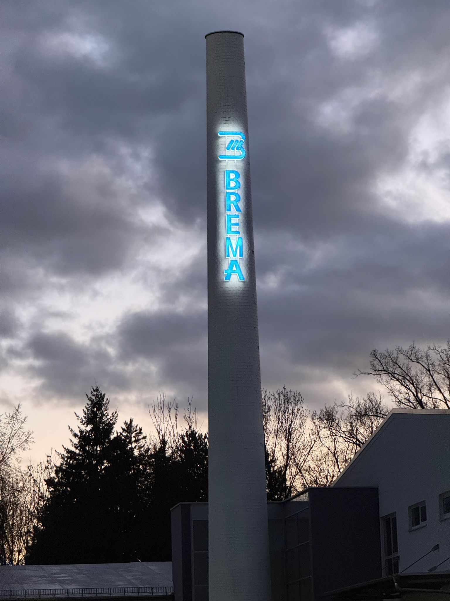Schwabach hat ein neues Industrie-Wahrzeichen. Die Brema-Werke schmücken ihr neu benanntes Werk 2 auf dem ehemaligen Schmauser-Gelände fortan mit einem großen, leuchtenden Logo auf dem Schornstein des Areals.