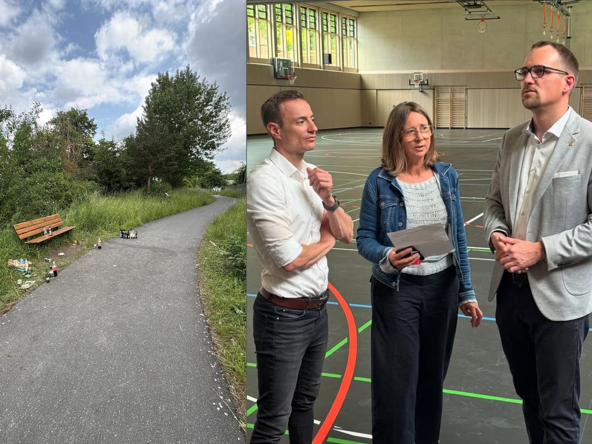 Links: Foto Baratier | Scherbenmeer und Unrat nach dem Vatertag auf Schwabacher Wegen Rechts: Foto Peter Reiß | Fassungslosigkeit bei der Stadtverwaltung nach Besichtigung der Schäden in der Helm-Halle
