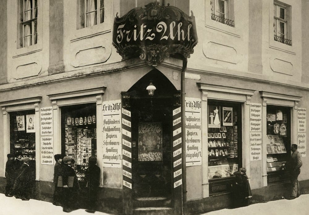 Foto: Buchhandlung Kreutzer - Ursprung der heutigen Buchhandlung. Der Papeterie- und Buch-Betrieb von Fritz Uhl, ca. im Jahr 1900