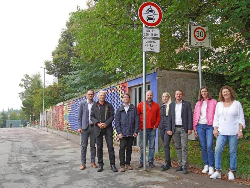 Foto: Stadt Schwabach - Begutachten die Umsetzung des Pilotversuchs (v.l.)(von links): OB Peter Reiß, die Stadtratsmitglieder Werner Sittauer, Dr. Markus Hoffmann, Bernhard Spachmüller und Magdalena Reiß sowie Dr. Maximilian Hartl, Referent für Umwelt und Gebäudemanagement, die Elternbeirats-Vorsitzende Andrea Reisinger und die Konrektorin der Zwieseltalschule, Christine Luxenburger.