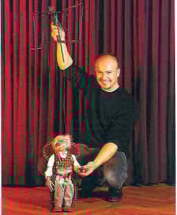 ![]() Foto: Marionettenbühne SC | Armin Vogel mit dem Gerch | Zur Person: Armin Vogel ist Puppenspieler aus tiefster Überzeugung. 1962 in Nürnberg geboren, steigt er bereits mit 16 Jahren professionell bei der Schwabacher Marionettenbühne ein und ist Teil der zweiten Gründergeneration, die der Bühne 1979 ihre feste Heimat im alten DG verschaffte. Seit 1996 ist er der Leiter der Schwabacher Marionettenbühne und folgte damit nach 50 Jahren auf die Gründerin Ruth Bloß. Vogel ist weiterhin hauptamtlicher Puppenspieler und in beratender Tätigkeit für verschiedene Theater tätig. |