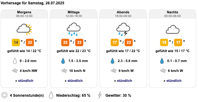 Milow singt “A slow and steady rain was falling, in the countryside” - und so könnte es auch heute sein. Am Besten eine robuste Regenjacke einpacken, damit man das Bürgerfest bei Wind und Wetter genießen kann. Positiv: Richtig kalt wird es nicht. Einem gelungenen Samstag steht also nichts im Weg!
